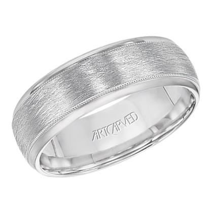 8mm wide, comfort fit, engraved wedding band with satin finish.